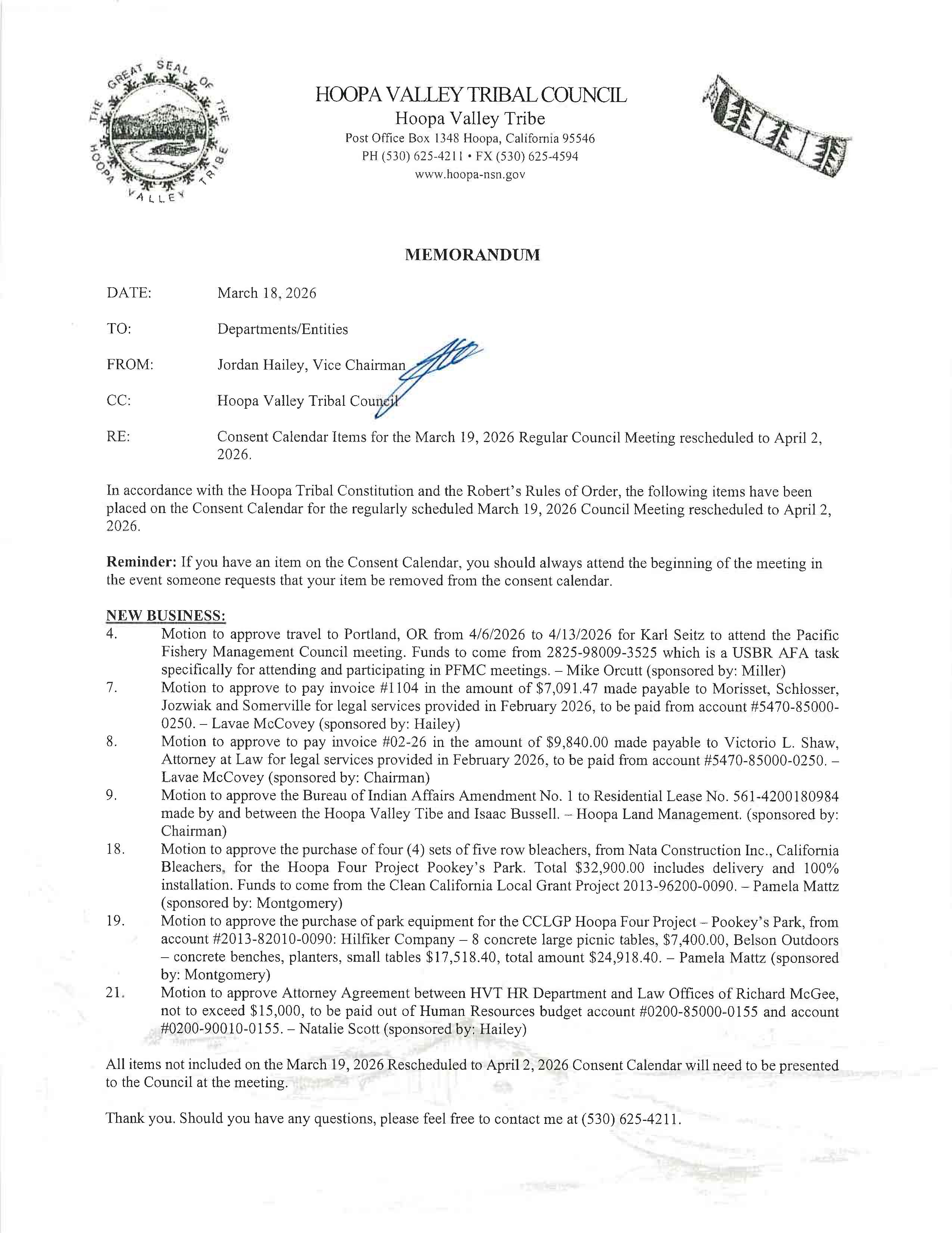 - Regular Council Meeting Consent Calendar for April 2, 2026