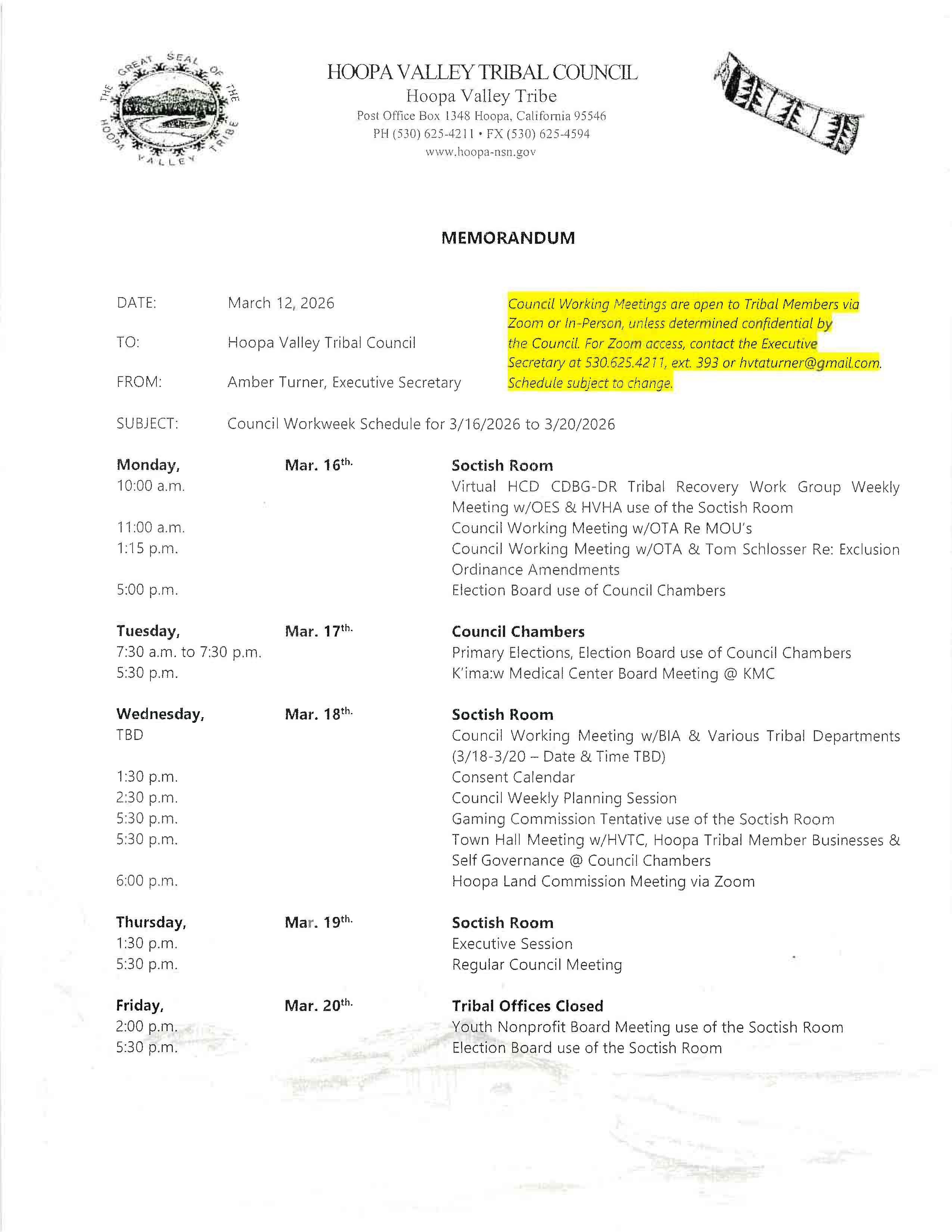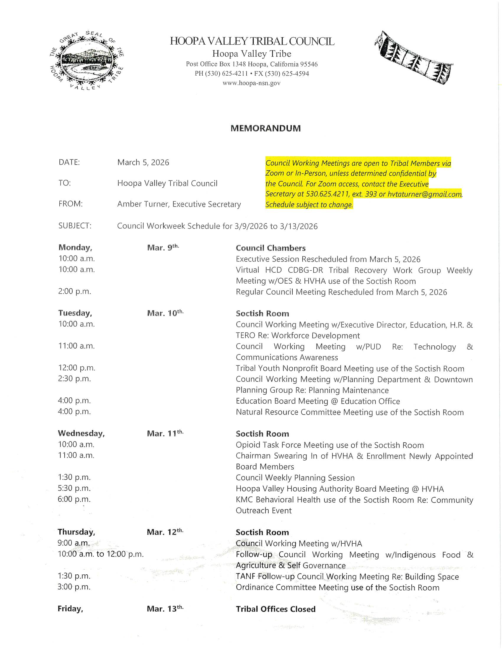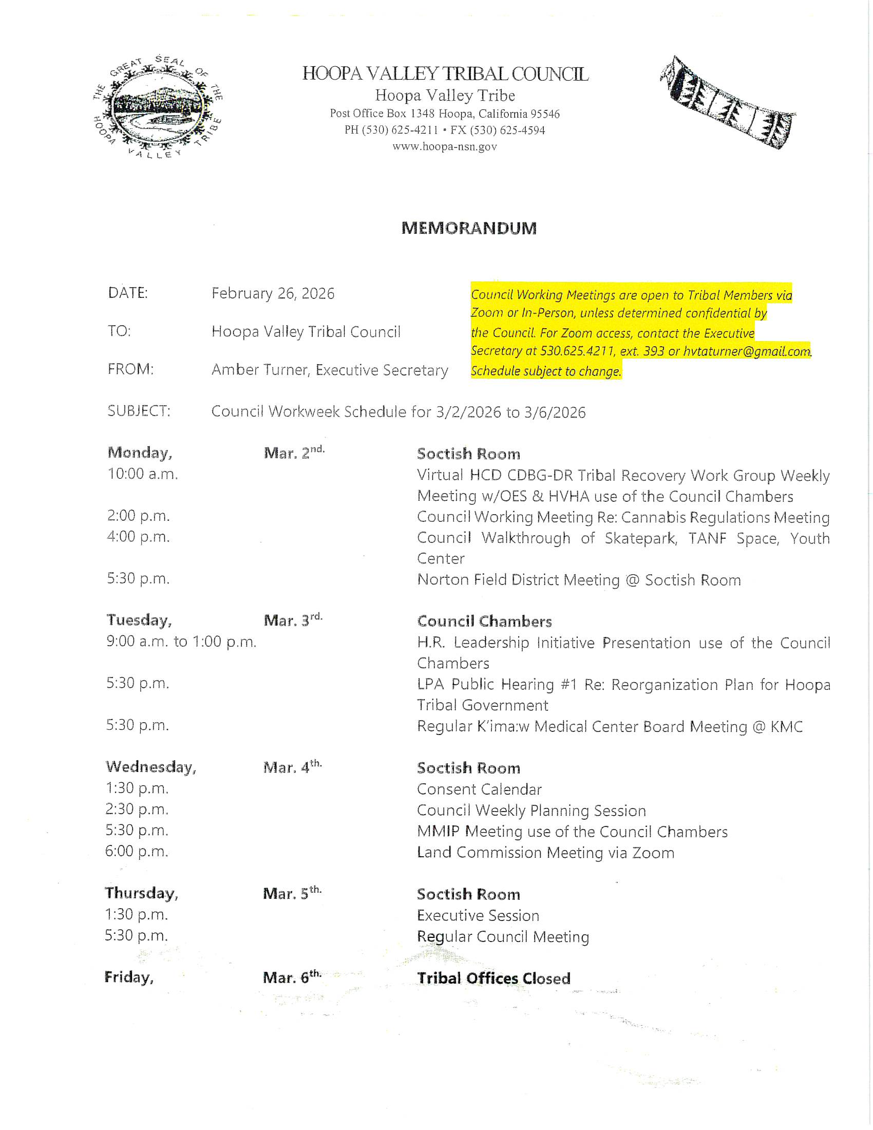 Hoopa Valley Tribal Council – Council Workweek Schedules